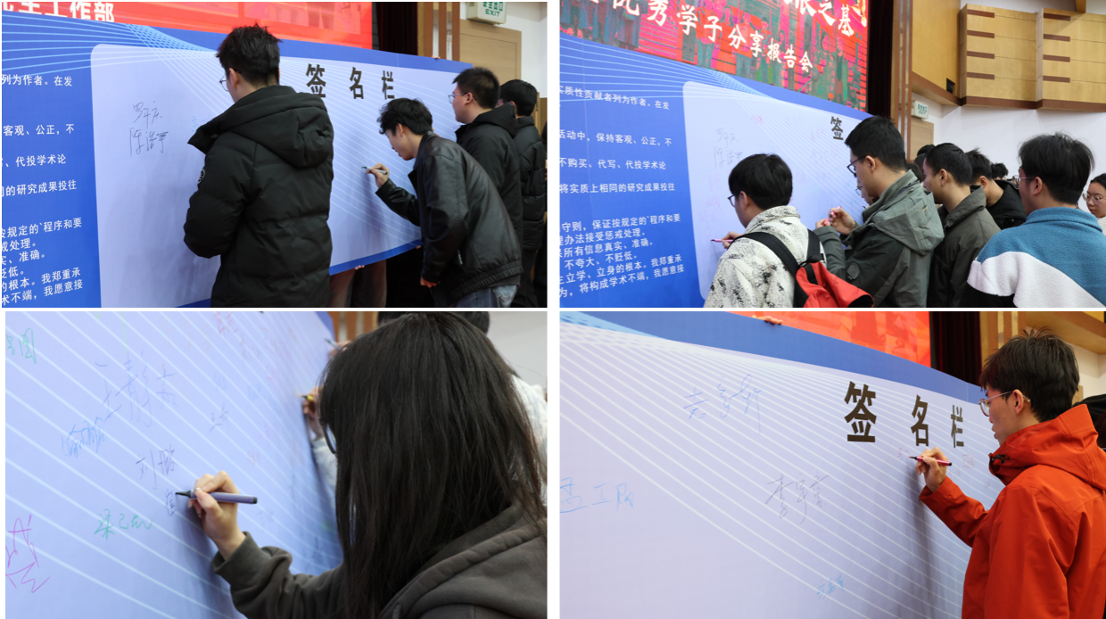 2023级博士研究生陈浩宇以如何在研究生阶段持续突破自我,树立学习目标为主题,向大家讲述自己在博士阶段从最开始在科研上的迷茫困惑、信心缺失到最后的锚定目标、坚守笃行的心路历程,他提出科研道路上一次次的失败不算真正失败,而是“科研常态”,面对这些困境,“心态破局”和永不言弃尤为重要;2023级博士研究生罗开庆系统梳理了自己从本科至博士阶段的求学与科研经历,借助“圆圈-兔子”理论,生动阐述了本科、硕士与博士三个学习阶段在目标与要求上的根本差异,寄语大家在专注学术的同时应强健体魄、管理情绪、常怀感恩之心,才能在漫长的科研道路上行稳致远;2023级博士研究生杨静雯在分享中向大家讲述,科研之路从无坦途,真正的突破往往不源于惊天动地的创举,而是在日复一日的坚持中把简单做到极致,将重复做到深入。只有沉心耕耘,才能静候那场属于自己的质变飞跃;2023级硕士研究生李宇童和大家分享了学术论文撰写的全过程以及一些研究生阶段实用的学习方法,并建议大家面对科研要从小处着手、敢于尝试;2023级硕士研究生詹文林向大家分享自己关于学科竞赛的思考与实践,她建议同学们学会精准择赛,建立系统化解决问题的思维模式,从而提升参赛效率,通过突破自身舒适区实现自我的真正的成长。