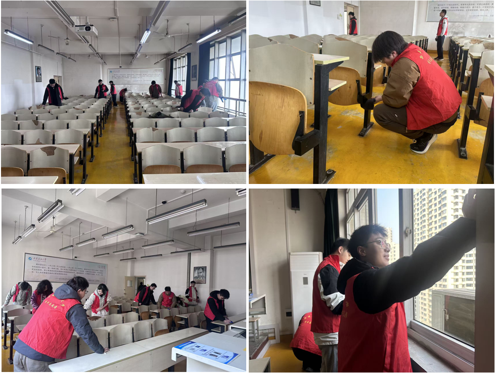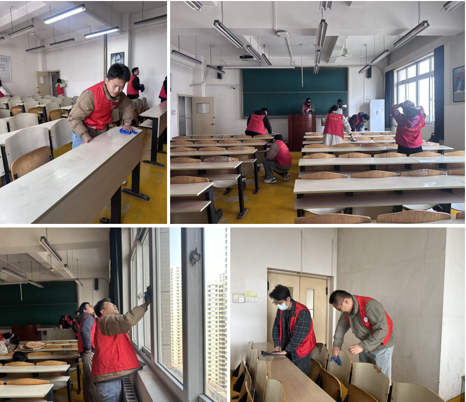 上午9时,教学楼志愿服务正式启动,20名研究生志愿者在雁塔校区二号教学楼集中集合后,迅速分为两组开展工作。志愿者们带着清洁工具走进各间教室,细致擦拭黑板、清理粉笔槽内残留粉笔灰,认真整理讲台教具,确保教学区域整洁有序;同时,逐一清理课桌内的垃圾杂物,细心清除桌面涂鸦和残留贴纸,积极倡导“无痕课堂”理念,引导同学们共同爱护教学环境;此外,志愿者们还对楼层仪容镜、导视牌、楼梯扶手、消防栓箱及走廊窗台等公共设施进行全面擦拭,不放过任何一处卫生死角。