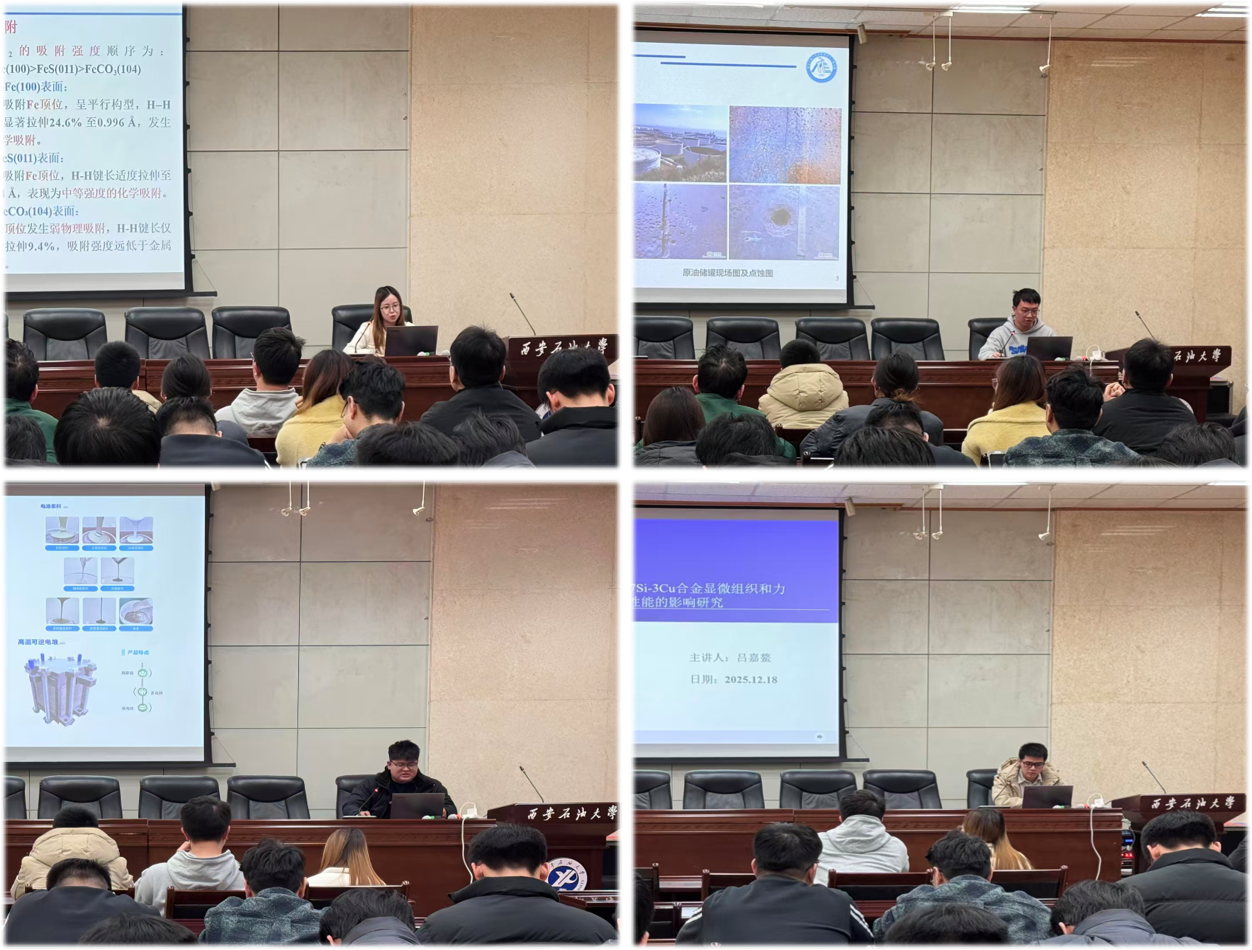 论坛中,四位主持创新基金项目的2023级硕士研究生,结合各自立项课题进行了系统汇报与深度分享。安海娟从原子尺度揭示了氢在管线钢表面的吸附机制;刘洢辰聚焦微生物腐蚀,探索基于生物竞争的绿色抑腐路径;肖辉致力于开发高熵钙钛矿材料,以提升固体氧化物燃料电池的阴极性能;吕嘉鳌研究了陶瓷增强铝硅铜合金的显微组织调控与力学性能优化。汇报内容覆盖能源材料、腐蚀防护以及复合材料等多个前沿方向,充分展现了我院研究生在创新基金支持下的科研实践能力与创新思维。
